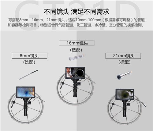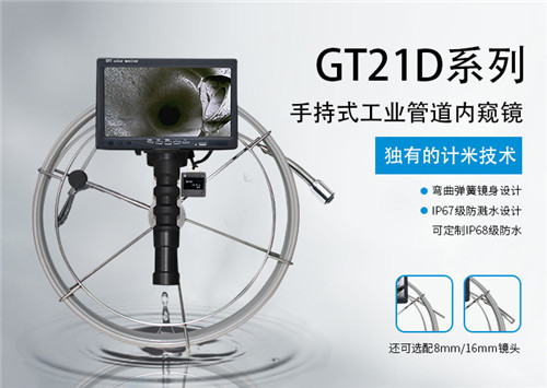 GT21D系列國(guó)產(chǎn)工業(yè)內(nèi)窺鏡是一款手持一體設(shè)計(jì)的工業(yè)管道內(nèi)窺鏡,鏡頭采用彈簧身設(shè)計(jì),能夠輕松通過(guò)1-2個(gè)90°或U型彎角,確保檢測(cè)的流暢性。GFRP硬質(zhì)檢測(cè)線盤(pán)采用耐磨耐腐蝕性強(qiáng)的玻璃纖維,直推有力不易打結(jié),收放自如可單人操作,另可選手持式鋼絞線,防摔耐磨韌性足。性價(jià)比高,功能i性強(qiáng)。175度廣角直視鏡頭,自帶LED燈光照明,亮度可調(diào)節(jié)。可選計(jì)米功能,實(shí)時(shí)顯示檢測(cè)線的使用長(zhǎng)度。根據(jù)自身需要可搭配21mm/16mm/8mm直視一體鏡頭,滿足各類需求的管道檢測(cè)項(xiàng)目。