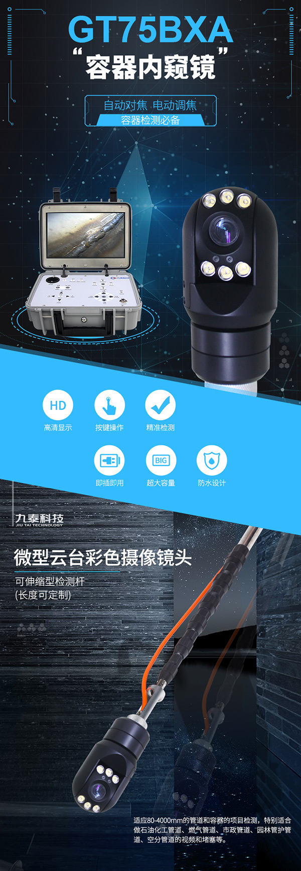 GT75BXA容器檢測內(nèi)窺鏡采用微型云臺彩色攝像鏡頭,搭配可伸縮性檢測桿(長度可定制),手持更方便,適用于80mm-1200mm的空間、管道及容器檢測項目。